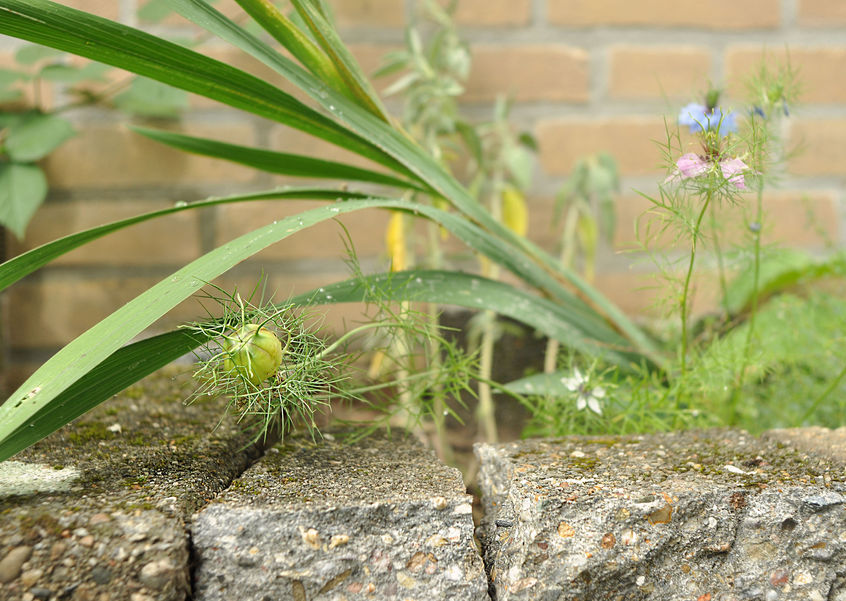Per godere di piante belle e commestibili fin dal primo anno di realizzazione è stato seminato un mix di piante annuali commestibili. In questo modo gli spazi vuoti lasciati delle piante ancora giovani sono stati riempiti con bellissimi fiori commestibili come il lino (Linum usitatissimum) e la nigella (Nigella damascena).